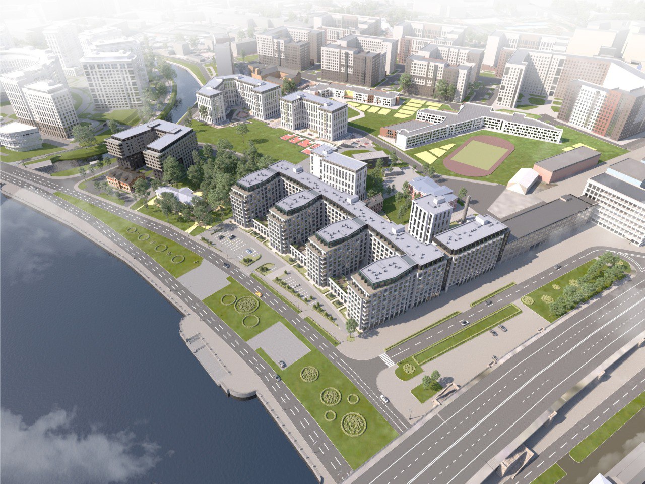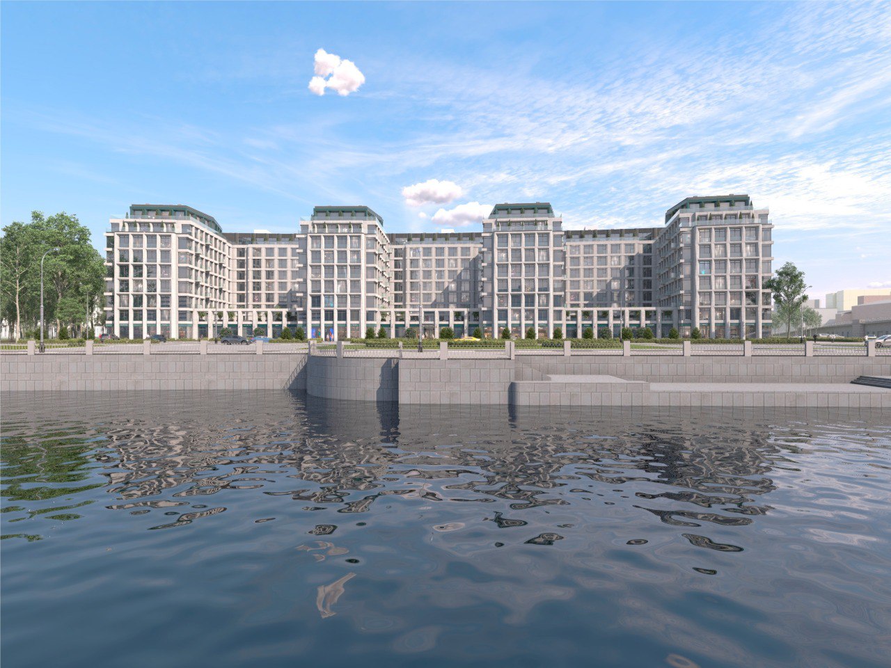 "ДП" рассказывал, что вместо формирования сплошного фасада вдоль набережной архитектор выбрал схему с дворами-курдонёрами, выходящими торцами к воде, формируя таким образом больший видовой фронт.
