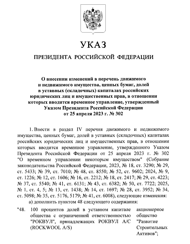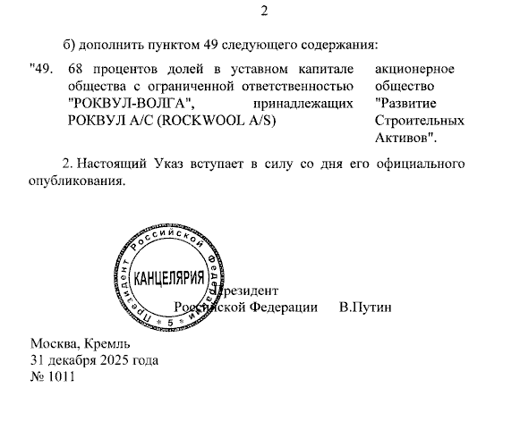 Помимо этого, в ведение АО "РСА" перейдут 68% долей в уставном капитале другой дочерней компании Rockwool, ООО "Роквул-Волга". Указ вступает в силу с 13 января.
