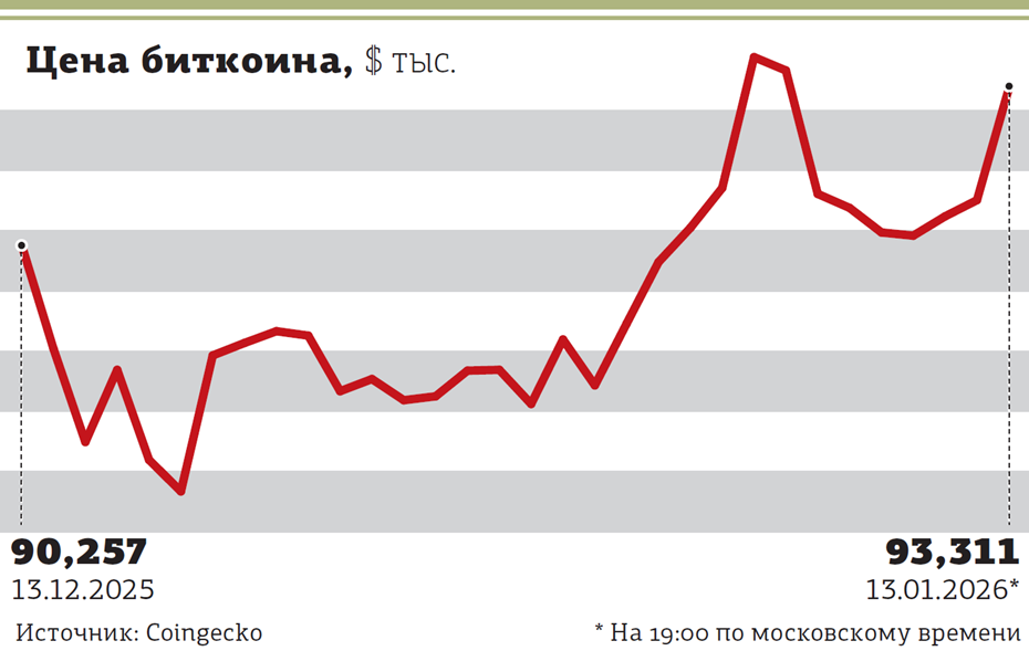 Биткоин первую неделю 2026 года провёл ударно, обновив максимум с ноября предыдущего года. Вторая неделя ознаменовалась коррекцией и новой попыткой роста. В итоге к 19:00 по московскому времени 13 января, по данным информационного ресурса Coingecko, самая популярная криптомонета стоила $93,311 тыс. За неделю она подешевела на 0,5%. Эфир потерял в цене за тот же период 3%, и вечером во вторник за него давали $3177,9. Совокупная капитализация всех выпущенных криптомонет составила на этот момент $3,263 трлн.