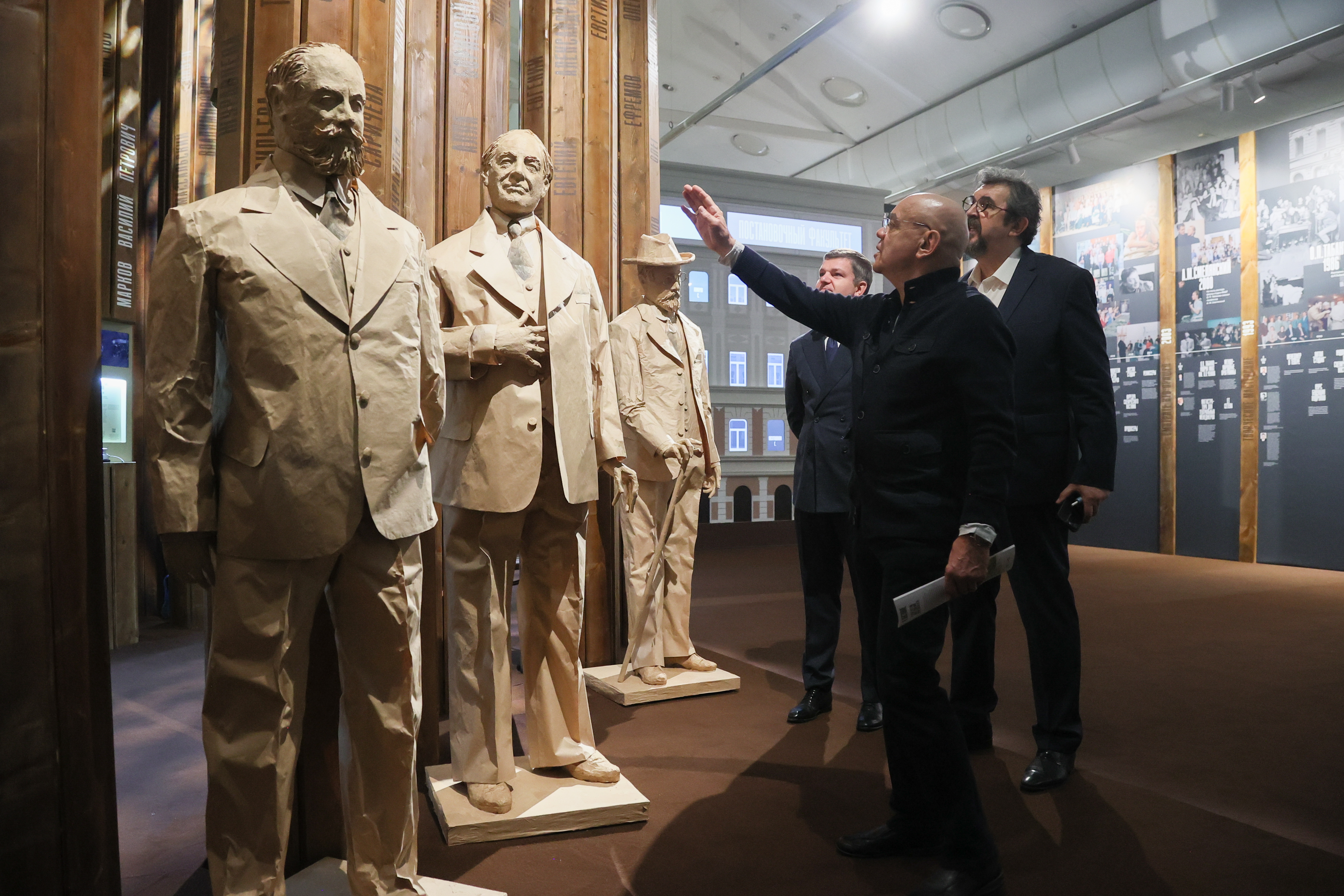 Художественный руководитель Российского государственного театра "Сатирикон" Константин Райкин и ректор Школы-студии МХАТ Игорь Золотовицкий (слева направо) на открытии выставки "Школе-студии МХАТ - 80. Семейный альбом" в Новом Манеже.