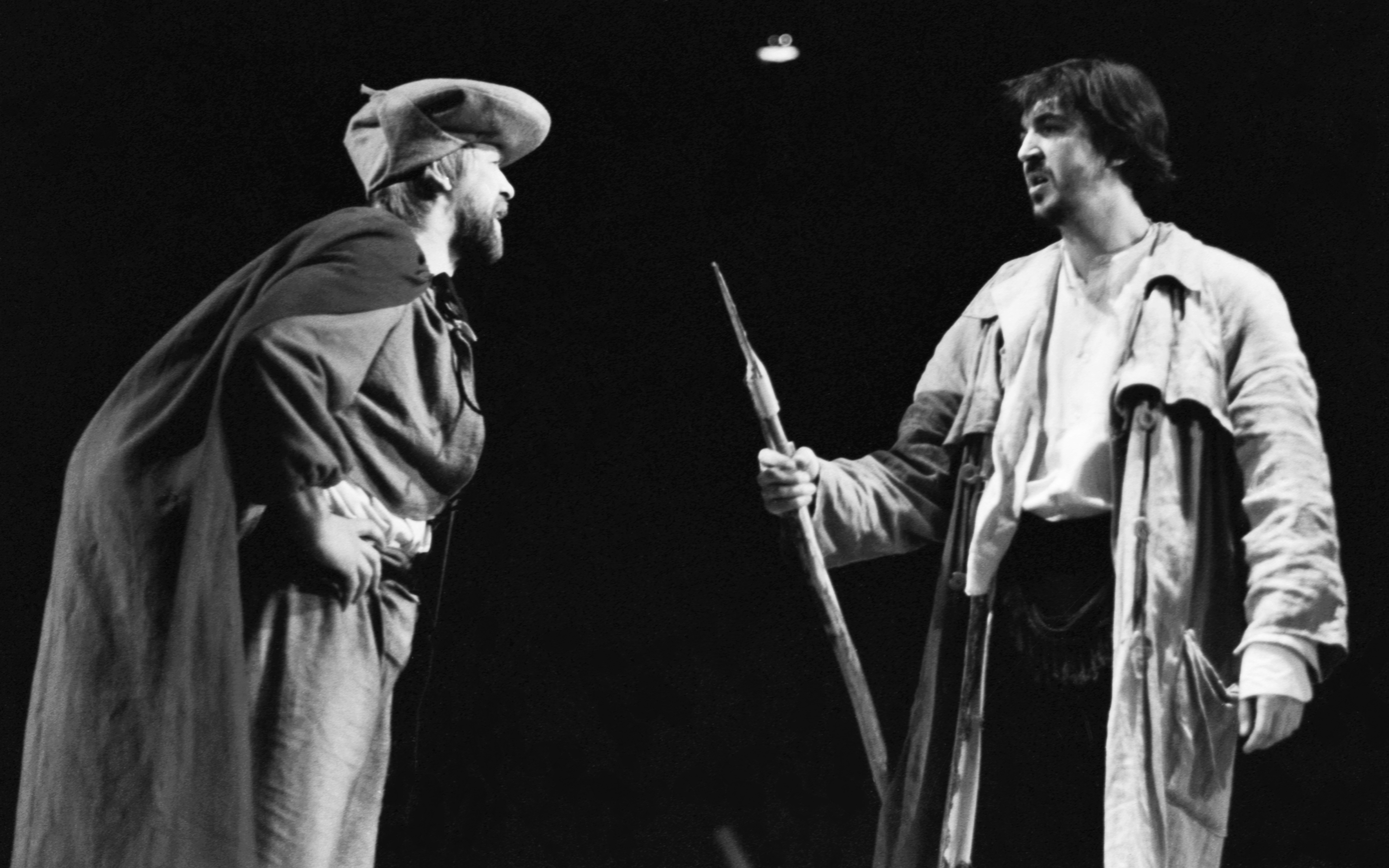 Сцена из спектакля "Дон Кихот" по пьесе Михаила Булгакова. Режиссер - Роман Козак. Артисты А. Феклистов (Санчо Панса (слева) и И. Золотовицкий - Дон Кихот. Московский драматический театр имени К.С. Станиславского. Февраль 1992 года