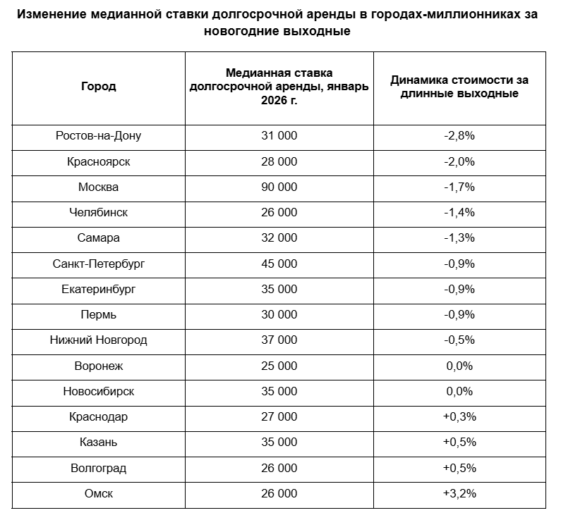 Изменение медианной ставки долгосрочной аренды в городах-миллионниках за новогодние выходные
