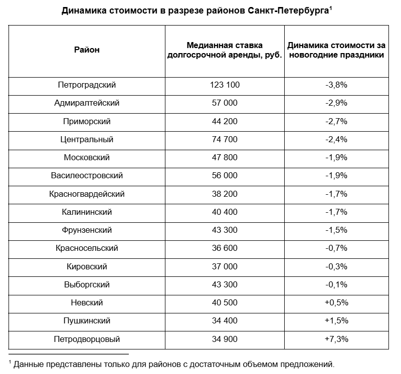 "Снижение медианной ставки долгосрочной аренды в Петербурге произошло в большинстве районов. Наиболее значительно стоимость сократилась в Петроградском — на 3,8%, до 123,1 тыс. руб. Также медианная цена сдаваемых квартир более заметно снизилась в Адмиралтейском (–2,9%; 57 тыс. руб.), Приморском (–2,7%; 44,2 тыс. руб.) и Центральном (–2,4%; 74,7 тыс. руб.) районах", — передаёт пресс-служба "Яндекс.Аренды".