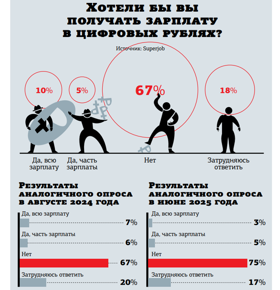 Россияне относятся к цифровому рублю со сдержанным, но стабильным скепсисом. Согласно данным свежего опроса, проведённого порталом Superjob, частично или полностью готовы получать зарплату при помощи нового платёжного средства только 15% работников. Не согласны 67%, и это ровно то же значение, что было в самом первом опросе на эту тему, проводившемся в августе 2024 года, когда цифровой рубль был абсолютной теорией.