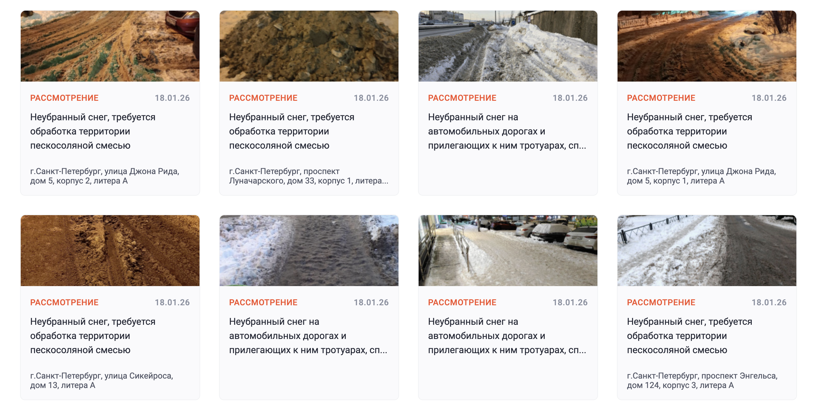 Жители Санкт-Петербурга 18 января направили на портал "Наш Санкт-Петербург" около 400 обращений, связанных с состоянием уборки снега и льда.