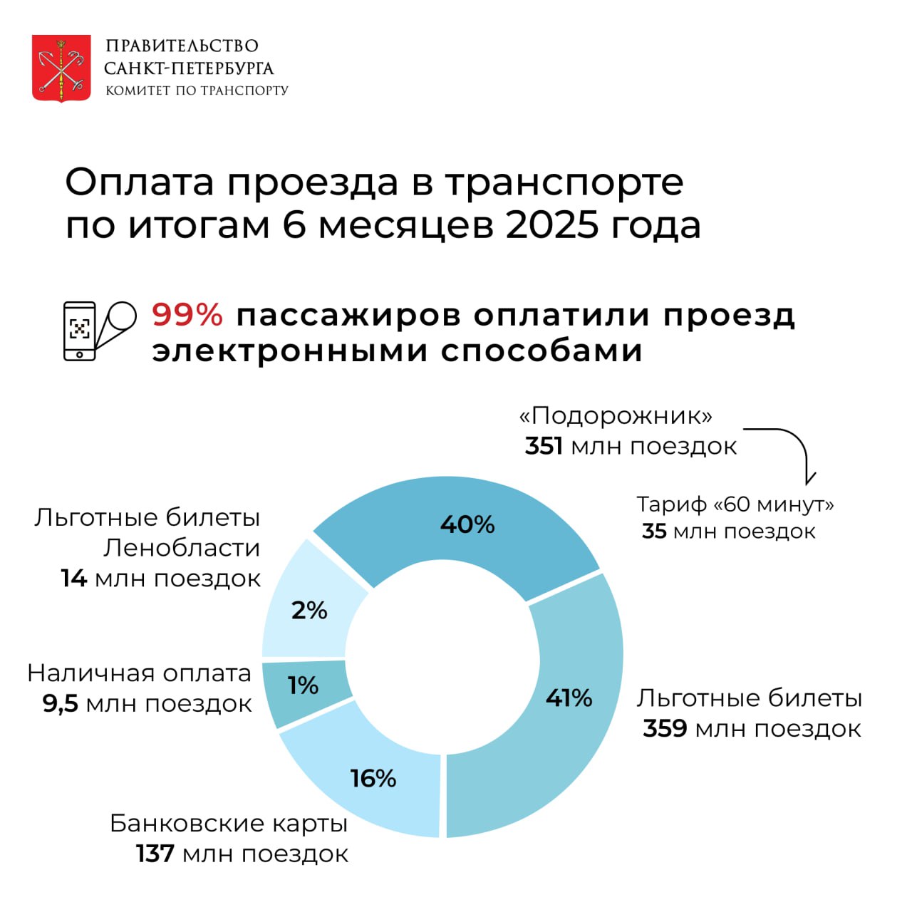 Согласно последним актуальным подсчётам городского комитета по транспорту, с января по июнь 2025 года подавляющее большинство пассажиров в Петербурге — 99% — оплачивали поездки электронными способами.