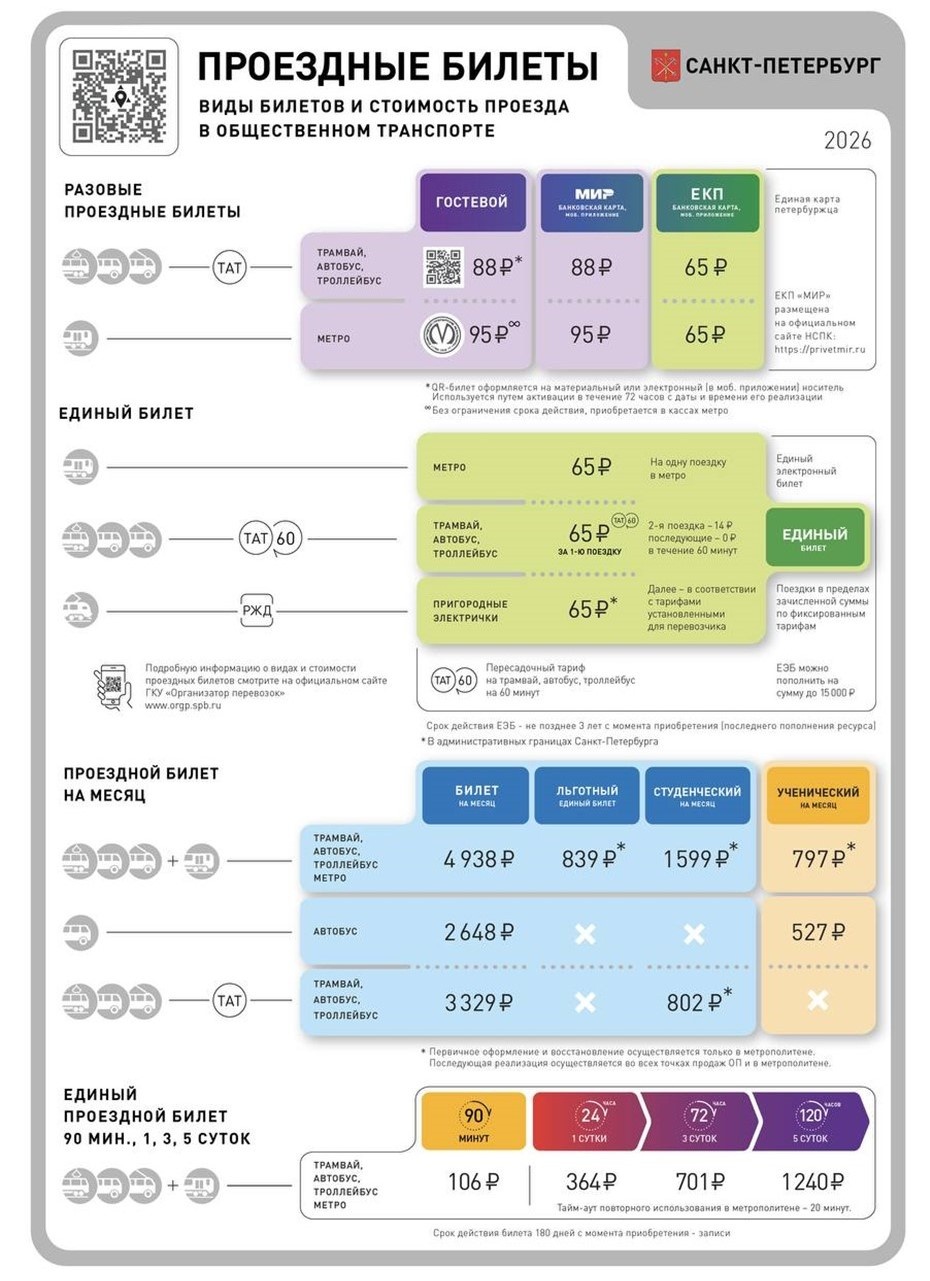 В 2026 году месячный единый билет, позволяющий без ограничений пользоваться всеми видами наземного транспорта в Петербурге и метро, подорожал с 4489 до 4938 рублей.