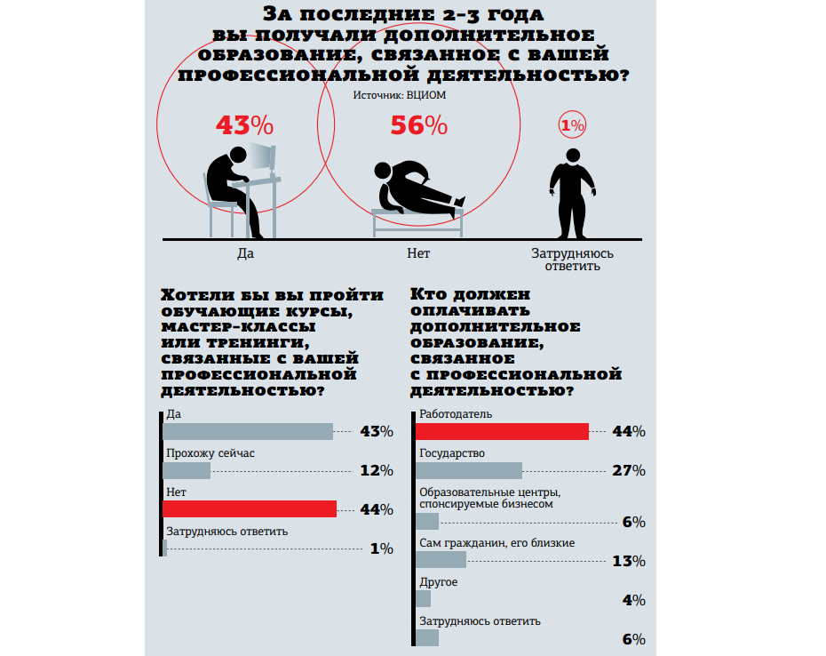 При этом на вопрос, кто должен оплачивать это самое дополнительное образование, больше половины респондентов ответили: работодатель или государство (44% и 27% соответственно). Возложить финансовое бремя на себя оказались согласны только 13%.
