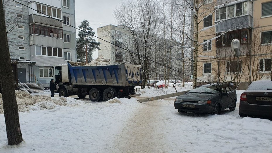 Грузовик наехал на фонарный столб, опрокинув его на припаркованный автомобиль в Сертолово 24 января, сообщают очевидцы.