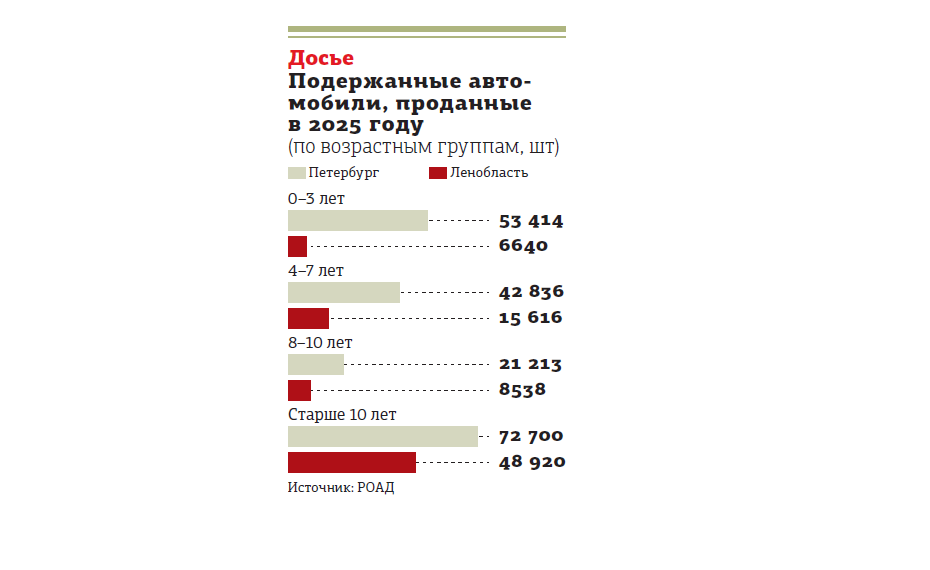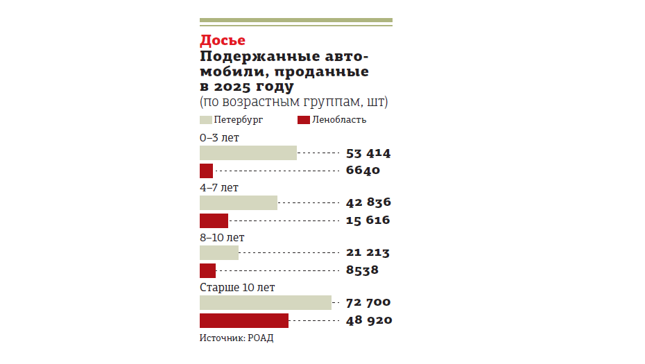 Из 190 тыс. подержанных автомобилей, которые были проданы в Петербурге за 2025 год, 72,7 тыс. имеют возраст больше 10 лет. Такие данные эксклюзивно предоставили "ДП" в Ассоциации "Российские автомобильные дилеры" (РОАД). В Ленинградской области картина ещё более красноречивая: из 79,7 тыс. подержанных автомобилей, проданных в 2025 году, десятилетний возрастной рубеж преодолели 48,9 тыс.