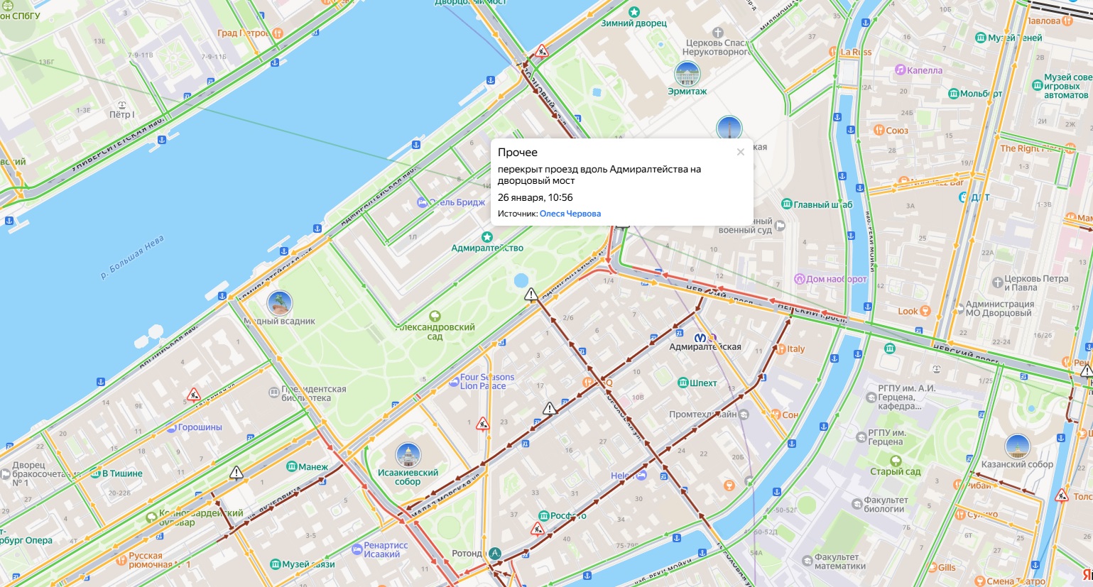 Утром 26 января в Северной столице перекрывали для проезда Троицкий мост, Дворцовую набережную и часть Адмиралтейского проезда. На прилегающих улицах быстро образовались пробки. По данным на 11:20, на затор водители пожаловались вдоль Адмиралтейства и в сторону Исаакиевского собора. В красный также окрасился Дворцовый мост и Невский проспект.