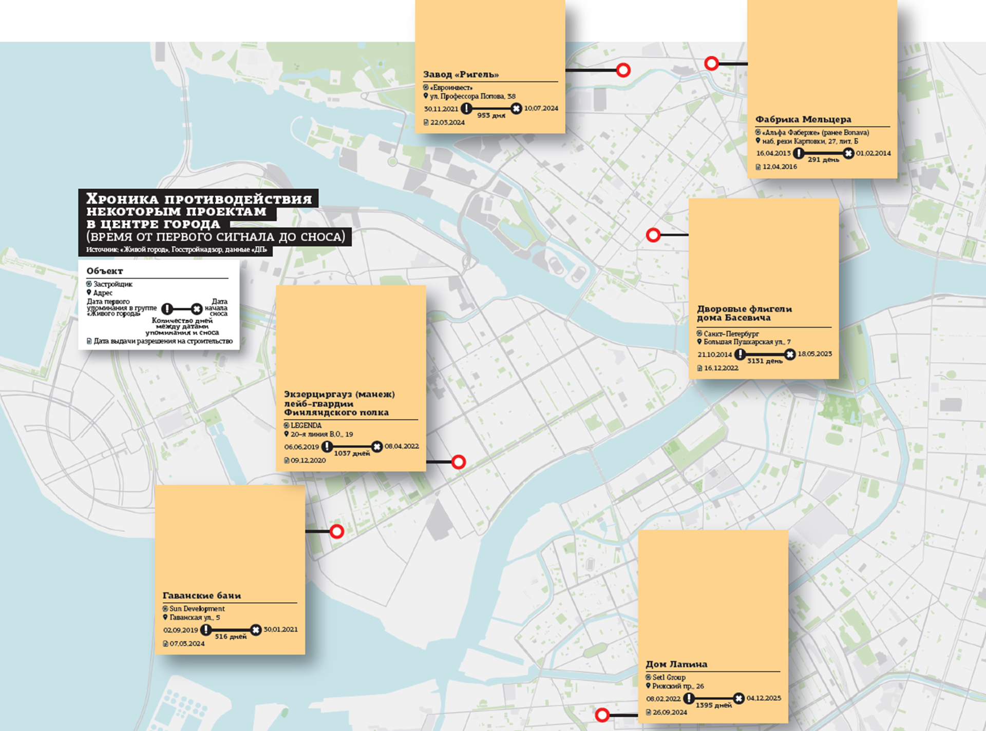 Хотя по отдельным объектам градозащитные конфликты длятся более 10 лет, как это происходит на Охтинском мысу или на участке ВНИИБ, обычно активная фаза противостояния занимает 2–3 года. В одних случаях протест заканчивается успехом градозащитников, как было с новостройкой на месте блокадной подстанции на Фонтанке, в других — проект в том или ином виде реализуется.