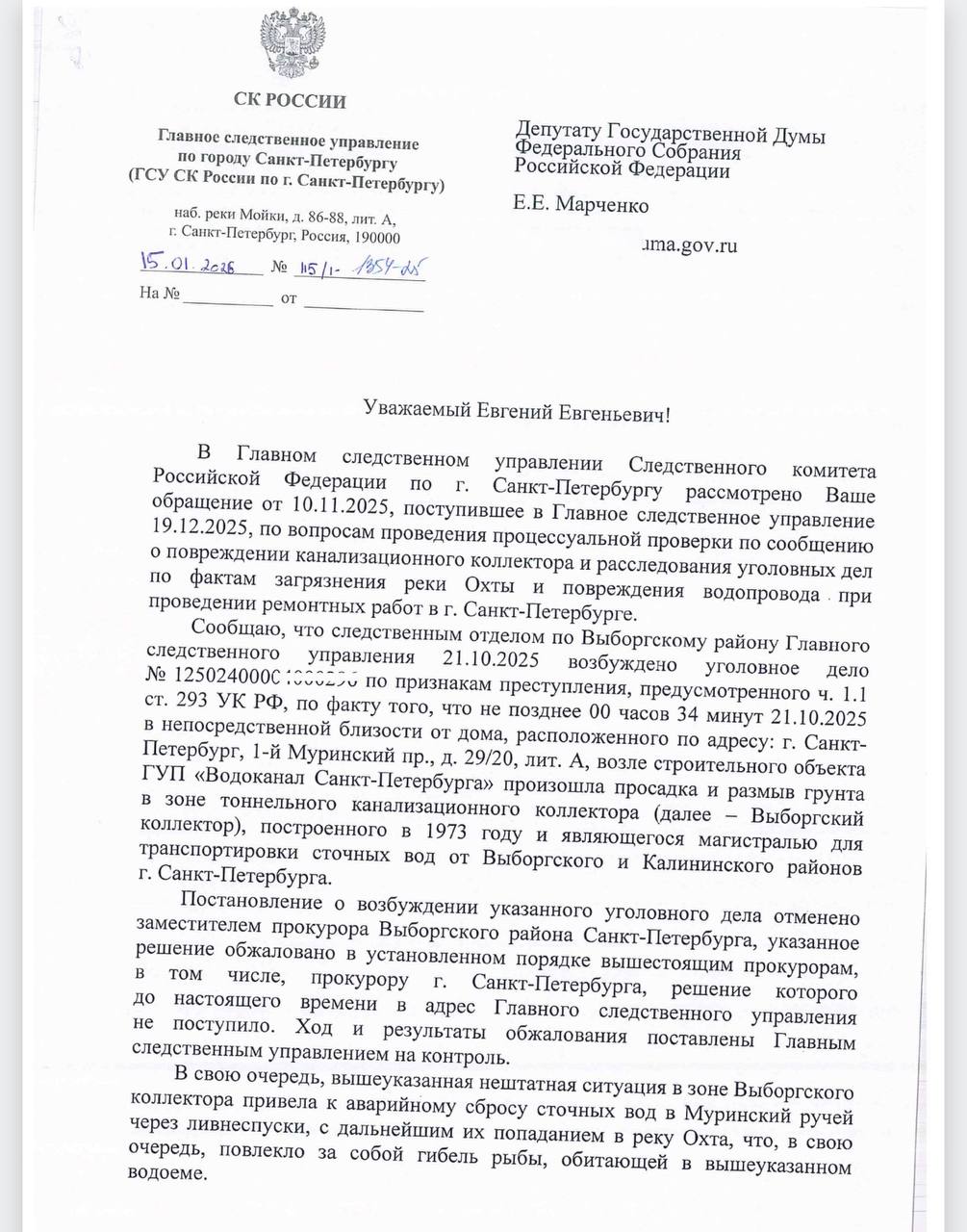 Согласно документу, расследование уголовного дела о массовой гибели рыбы в реке Охта после попадания в акваторию канализационных стоков продолжается. Ход дела поставлен на контроль в СК РФ.