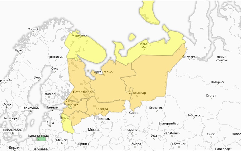 По информации учреждения, предупреждение начнёт действовать с 23:00 29 января до 10:00 30 января. Кроме того, "жёлтый" уровень опасности будет действовать до 13:00 1 февраля в связи с опасностью возникновения изморози.