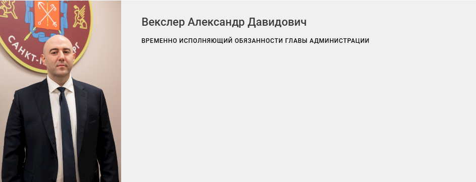 Нового главу района назначил губернатор Петербурга Александр Беглов. На сайте районной администрации Векслер указан как временно исполняющий обязанности главы администрации.