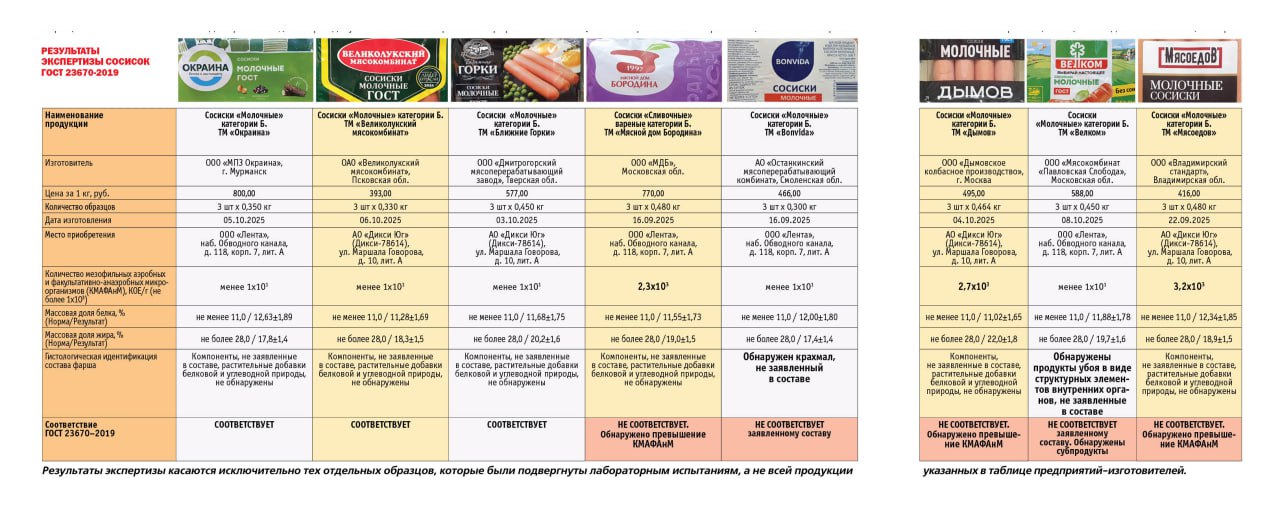 В качестве примеров "Общественного контроля" названы образцы из торговых сетей "Дикси" и "Лента": у сосисок ТМ "Мясоедов" (ООО "Владимирский стандарт") содержание МАФАнМ превышено в 3,2 раза, у ТМ "Дымов" — в 2,3 раза; в продукции ТМ "Bonvida" (частная марка "Ленты", изготовитель АО "Останкинский МПК") обнаружен крахмал, у ТМ "Велком" — субпродукты и ранее фиксировавшиеся несоответствия.