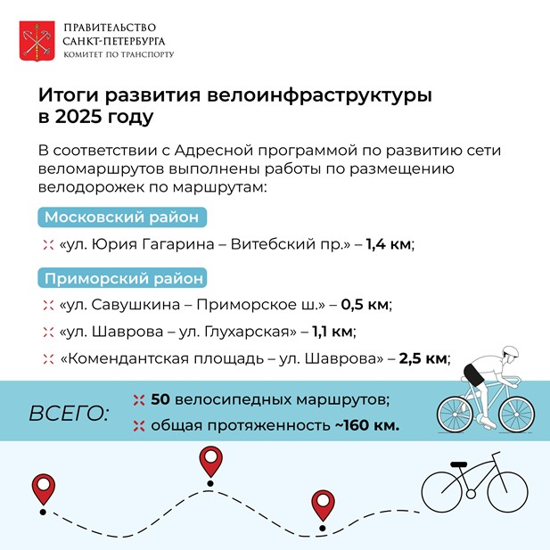В 2025 году в рамках Адресной программы в эксплуатацию введены три новых участка комфортной велоинфраструктуры: на ул. Типанова (Московский район) — 1,4 км (от ул. Юрия Гагарина до Витебского пр.), на ул. Яхтенной (Приморский район) — 0,5 км (от ул. Савушкина до Приморского шоссе) и на ул. Планерной (Приморский район) — 1,1 км (от ул. Шаврова до ул. Глухарской).