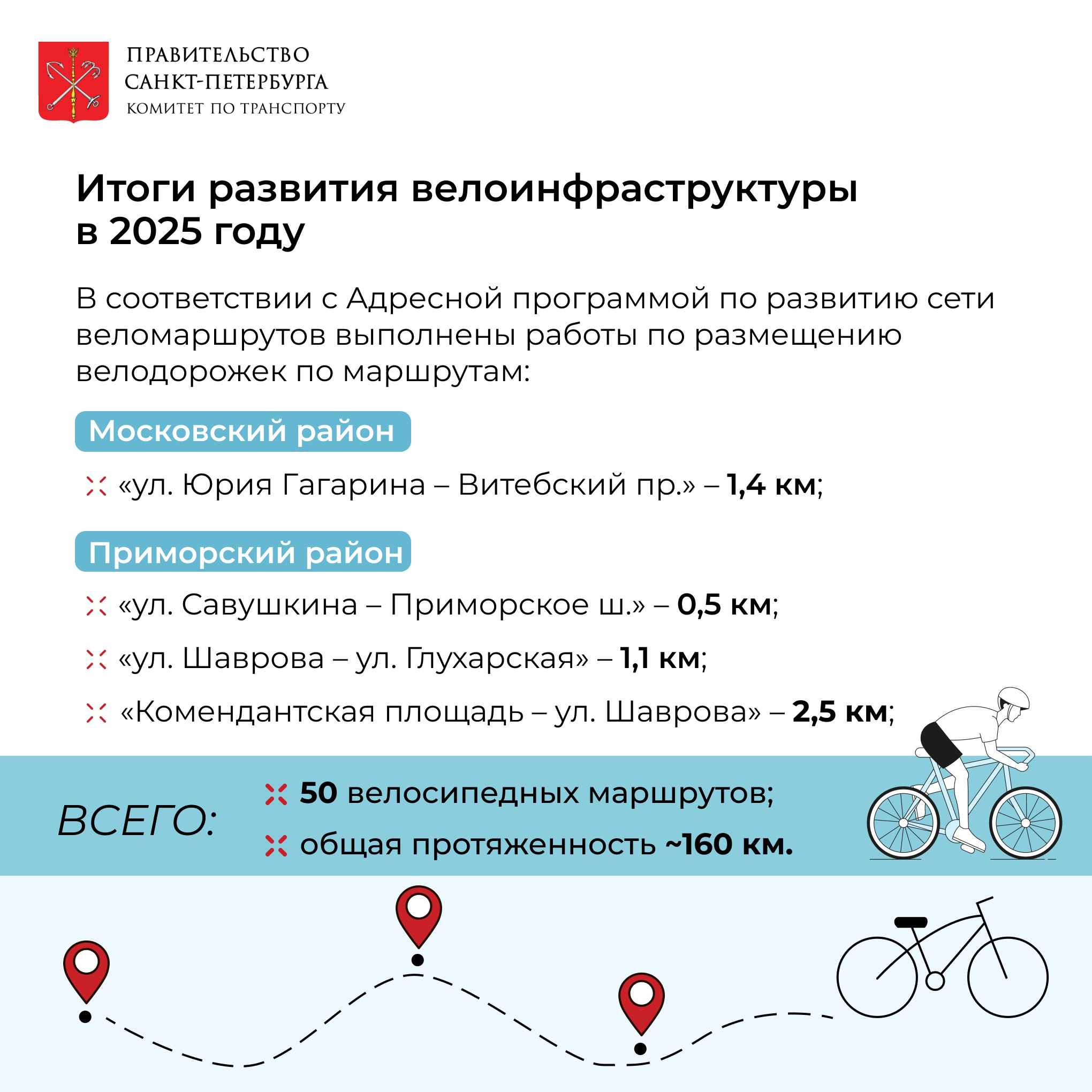 Велоинфраструктура появилась в двух районах города: Приморском и Московском. Так, велодорожку протяжённостью 2,5 км открыли на Комендантском проспекте от Комендантской площади до Шуваловского проспекта. Построен веломаршрут Глухарская улица – Планерная улица – Яхтенная улица длиной 1,6 км и два участка на улице Типанова.