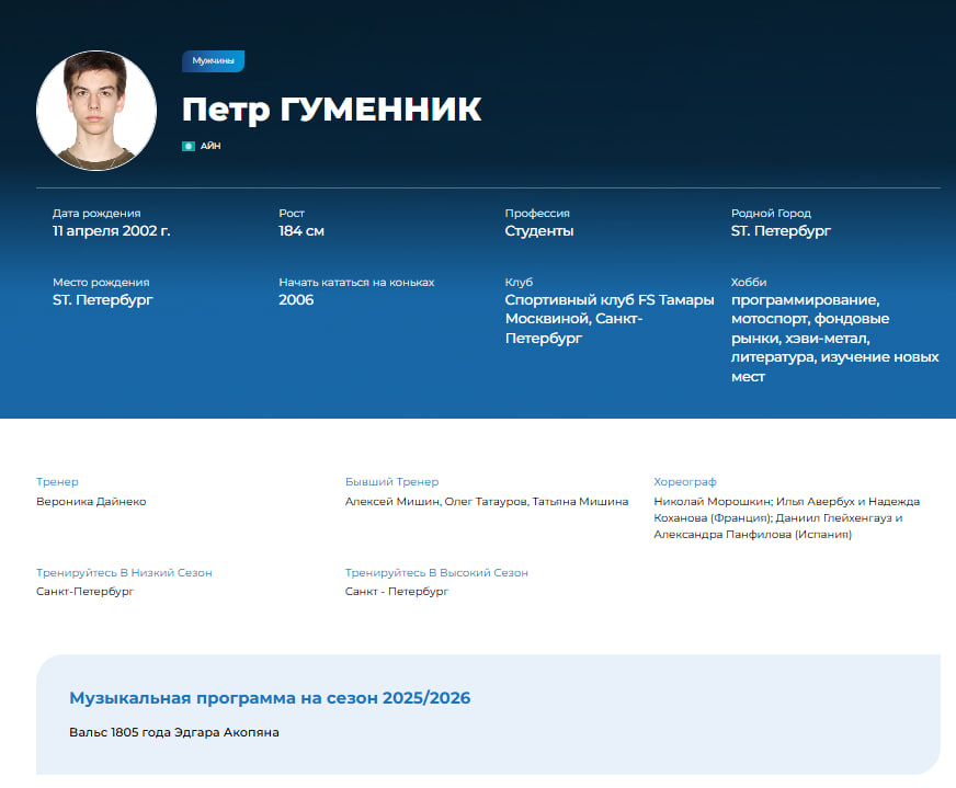Карточка российского фигуриста Петра Гуменника