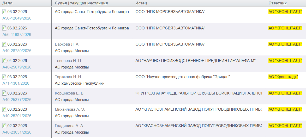 В основном иски касаются неисполнения или ненадлежащего исполнения обязательств по договорам поставки. Общая сумма исков за февраль в адрес АО "Кронштадт" превышает 79 млн рублей.