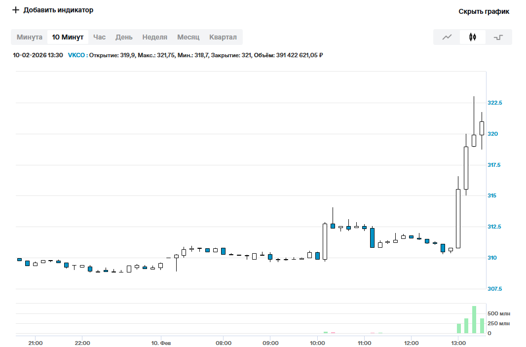 В настоящее время акции VK выросли примерно на 3,6% и торгуются в районе 320 рублей, следует из информации с сайта Московской биржи. Максимальное значение стоимости ценных бумаг компании за день составило 323 рубля. Утром акции VK торговались на уровне 310 рублей.