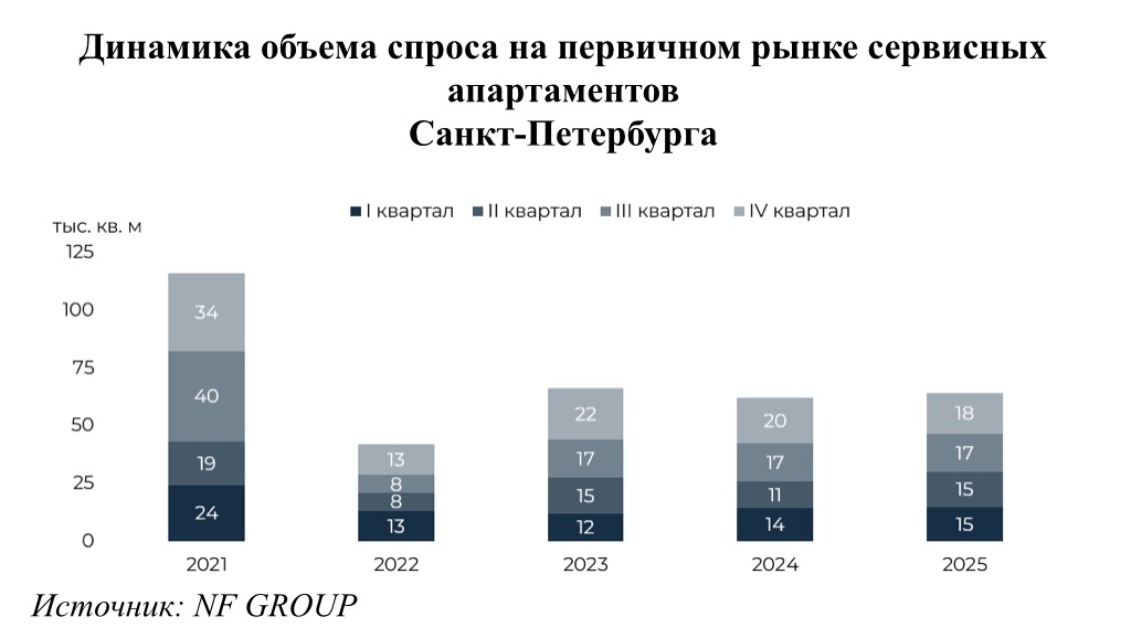 Объём предложения на первичном рынке сервисных апартаментов в Петербурге сократился по итогам 2025 года до 111 тыс. м2 (3,6 тыс. лотов), что на 21% по площади и на 24% по количеству лотов ниже рекордного уровня 2024 года, сообщили аналитики NF GROUP.