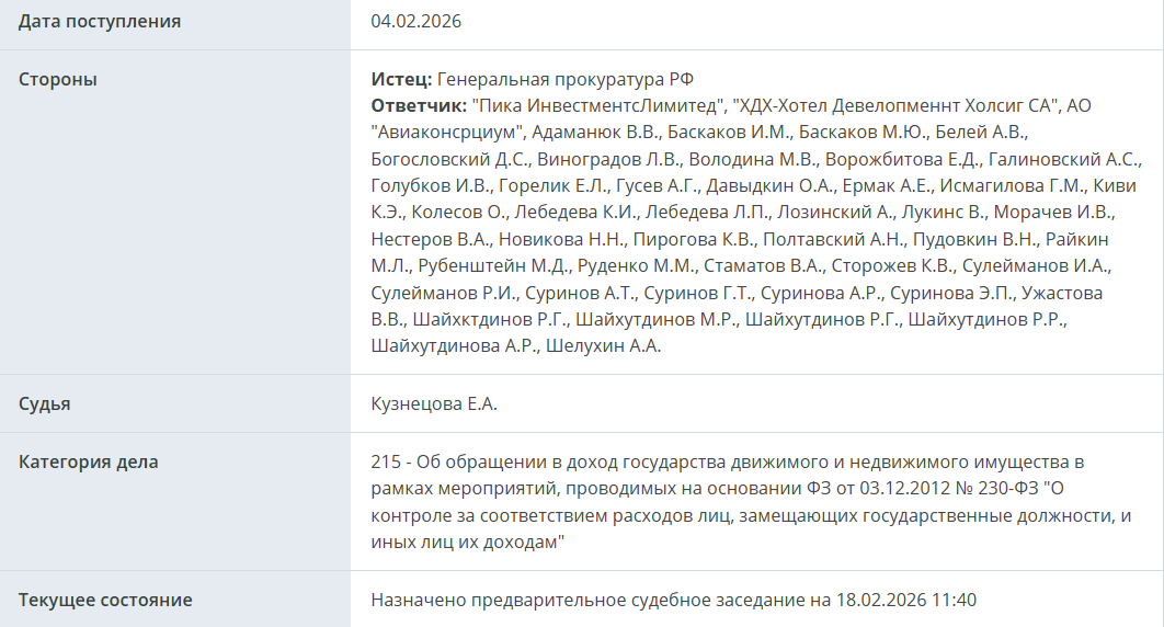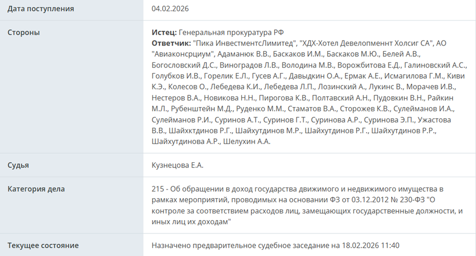 Предварительное слушание по иску Генпрокуратуры назначено на 18 февраля. Дело слушается в Никулинском районном суде Москвы. Ранее суд также наложил обеспечительные меры на активы ответчиков: доли и акции компаний, входящих в ГК "Сирена-трэвел", оператора системы бронирования авиабилетов "Леонардо".