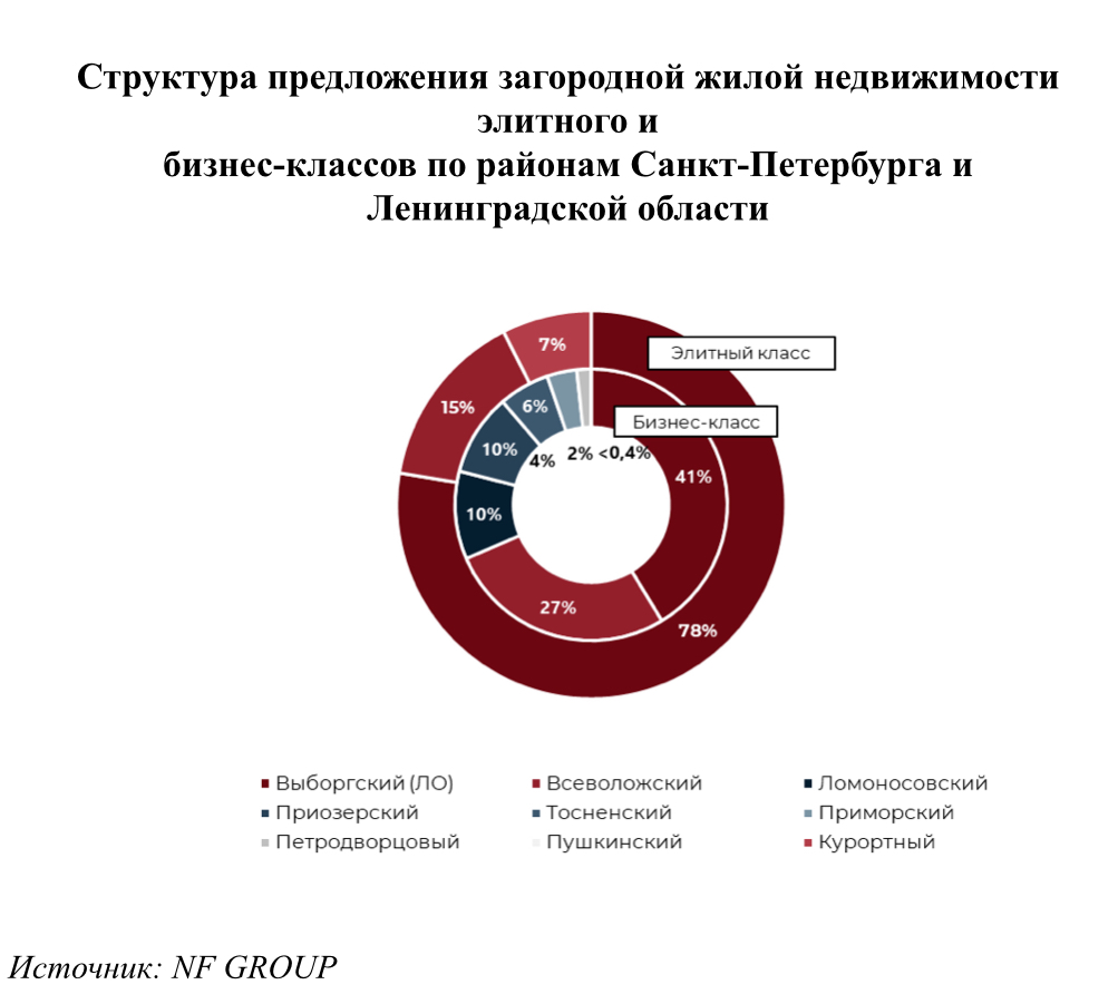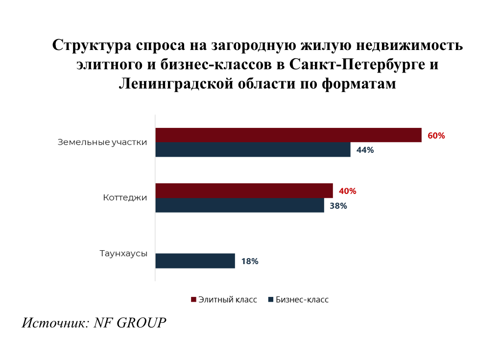 За 2025 год на первичном рынке было реализовано 68 элитных лотов загородной недвижимости и 239 лотов бизнес-класса. В бизнес-классе 44% сделок пришлось на земельные участки, 38% — на коттеджи и 18% — на таунхаусы.