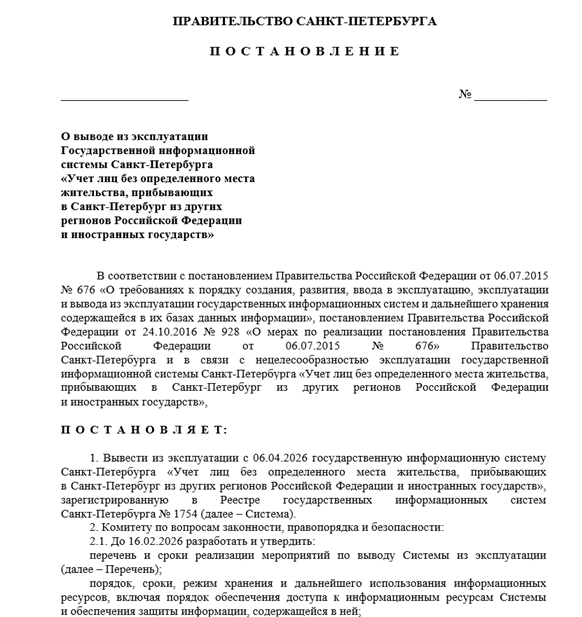До 16 февраля комитету по вопросам законности, правопорядка и безопасности поручено разработать и утвердить перечень и сроки реализации мероприятий по выводу системы из эксплуатации. Также предстоит определить порядок обеспечения доступа к информационным ресурсам ГИС и защиты информации, содержащейся в ней.