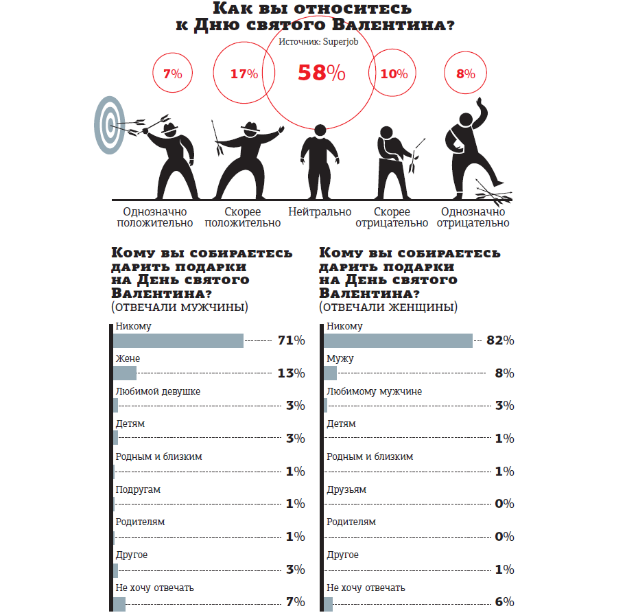 Причём что тогда, что сейчас встречаются люди, которые почему–то собираются покупать подарки не только своей половинке, но и детям, друзьям или даже родителям. Так что и в лучшие для Дня святого Валентина времена о сути этого праздника задумывались далеко не все. При этом в своём отрицательном отношении к нему признались 18%, а в положительном — 24%. Большинству же (58%) — всё равно.