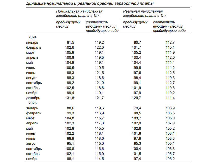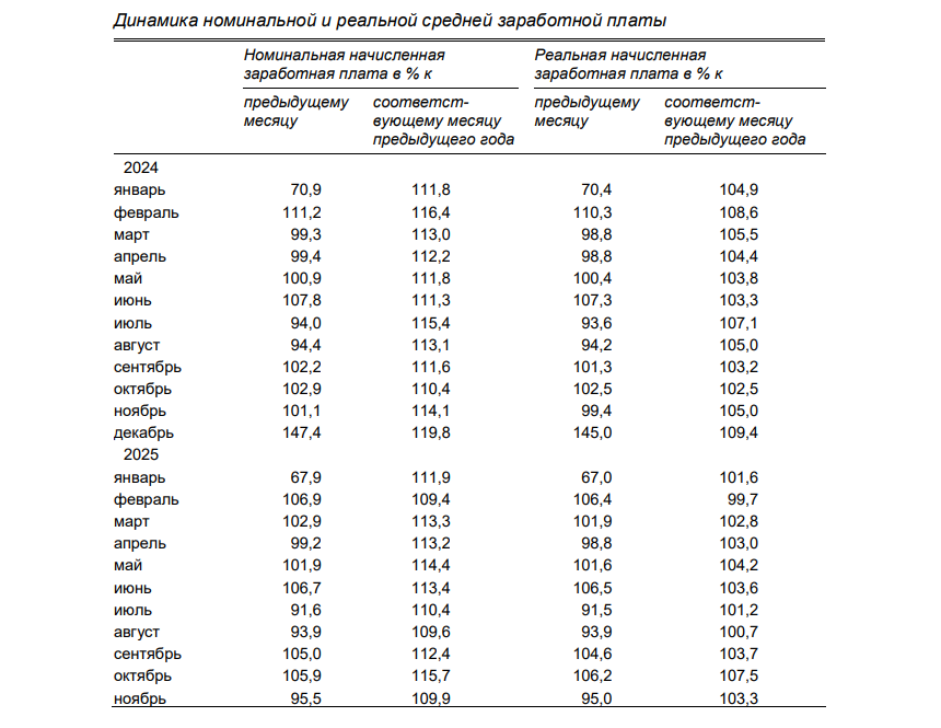 "Реальная начисленная заработная плата, рассчитанная с учётом индекса потребительских цен, в ноябре 2025 года составила 95% к уровню октября 2025 года и 103,3% — к уровню ноября 2024 года", — указывается в докладе Петростата.