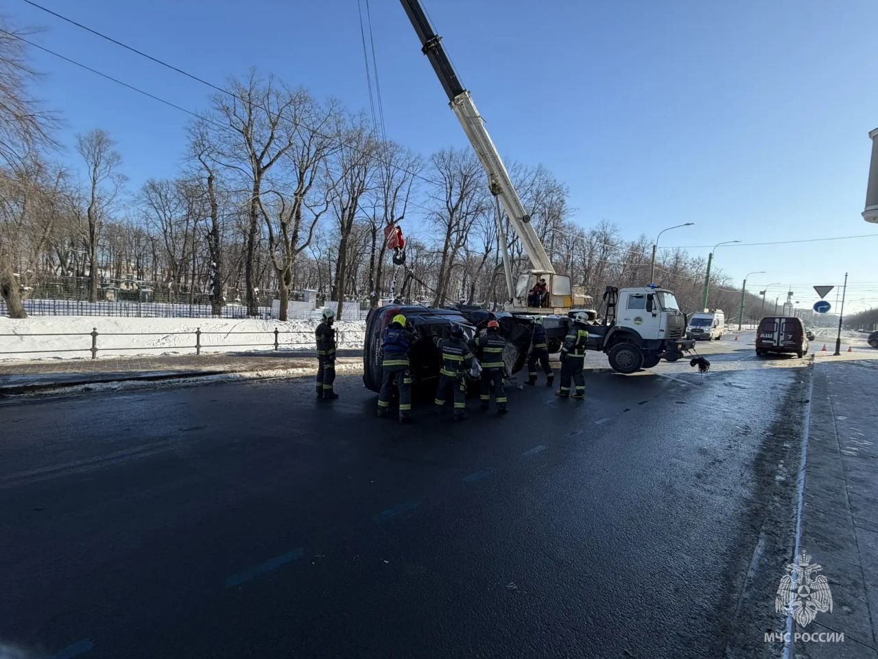 Как уточнили спасатели у дома №1 по Миллионной улице автомобиль после полёта над канавкой и столкновения опрокинулся на бок.