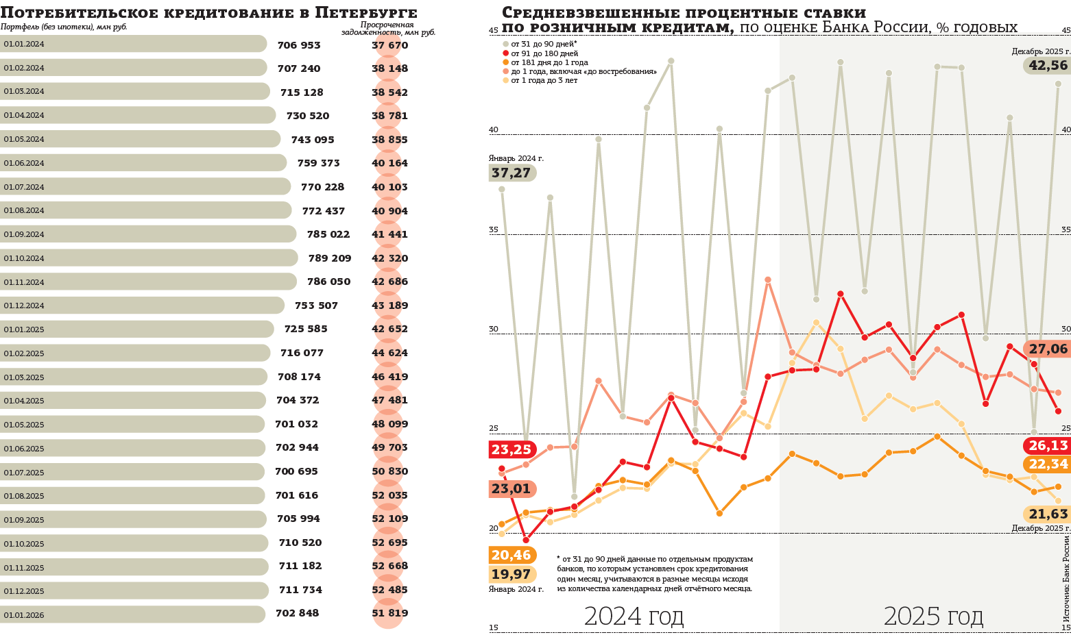 "Это искусственно выдавило с рынка потребкредитов целые категории заёмщиков. Плюс борьба с микрофинансовым направлением, запрет на выдачу новых микрозаймов для погашения старых и ипотечный тормоз, — перечисляет Олег Абелев. — С 1 февраля введено правило про один льготный кредит на одну семью, что радикально снизило воронку входа в льготную ипотеку. Если брать сегменты с точки зрения перспектив 2026 года, кредит наличными, скорее всего, будет мёртвый, потому что высокие ставки делают этот продукт бессмысленным". По его мнению, единственная надежда — снижение ключевой ставки во втором полугодии.