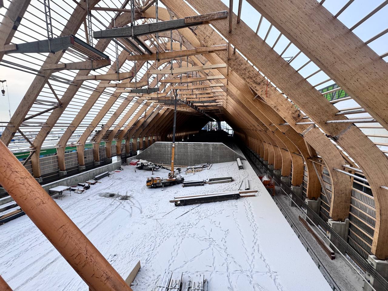 Хребтовый склад спроектирован с учётом высокой коррозионной активности минеральных удобрений и требований к сохранности продукции. Стены склада обшиваются профилированным листом из нержавеющей стали, устойчивой к агрессивным средам и атмосферным воздействиям. Прозрачные элементы фасада выполнены из высокопрочного стеклопластика, стойкого к ультрафиолету, что позволяет использовать естественное освещение и снижать нагрузку на инженерные системы. Облицовка склада достигла 66%. Несущие конструкции склада выполнены из древесины, прошедшей огне– и биозащитную обработку. Для условий хранения минеральных удобрений древесина демонстрирует большую устойчивость, чем металл и бетон, поскольку не подвержена интенсивной коррозии со стороны химически активной пыли и конденсата. Такое решение соответствует лучшим мировым практикам строительства специализированных складов для удобрений.