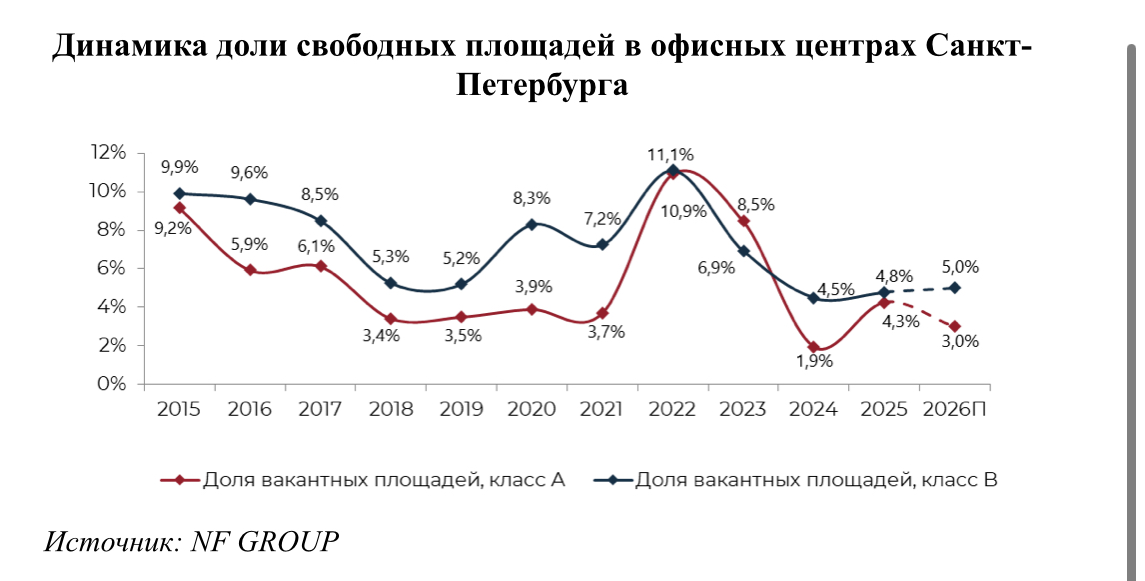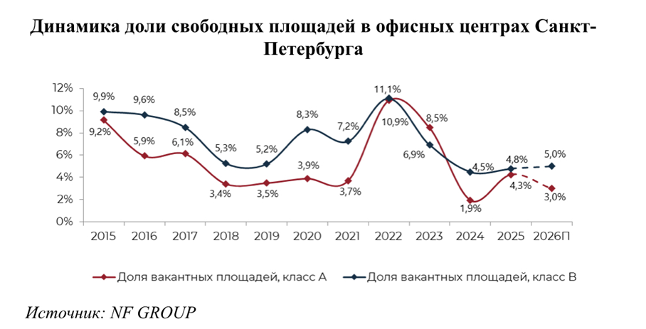 Уровень вакантности на офисном рынке Петербурга на начало 2026 года составляет 4,6% (год назад было 3,6%), сообщает NF Group.