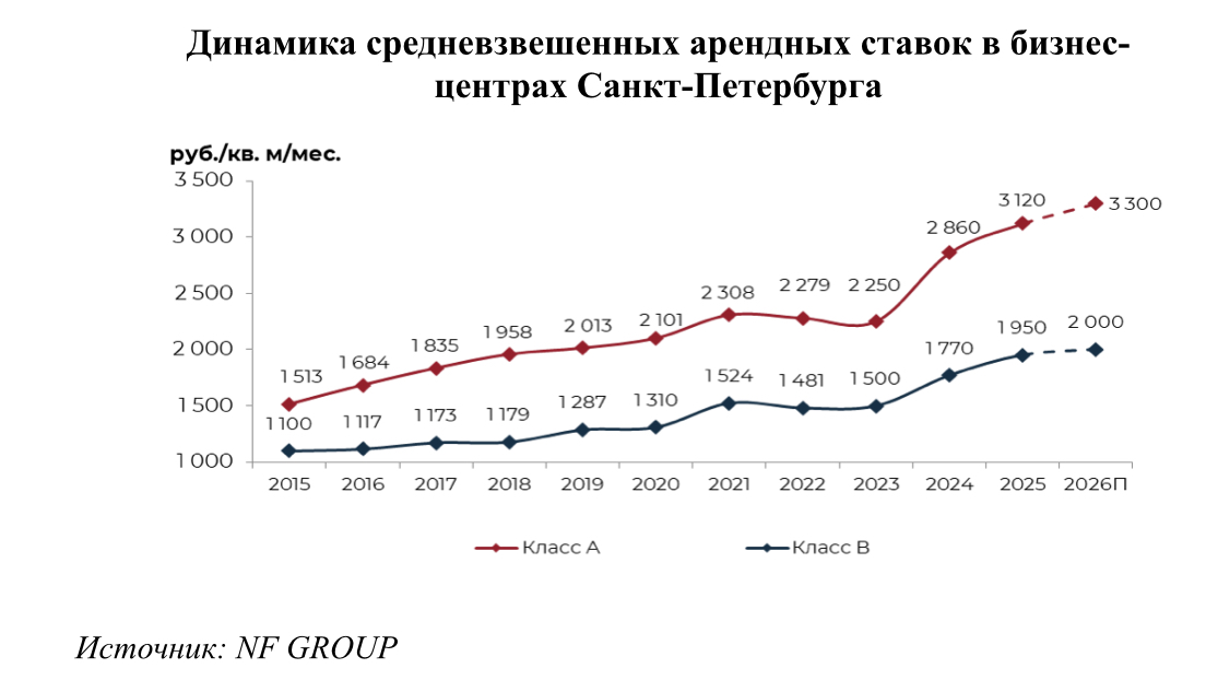 "Платёжеспособный спрос ограничен, рост ставок в 2026 году будет сдержанным и коснётся только самых ликвидных объектов и локаций. Рынок выходит на траекторию сдержанного и управляемого роста ставок аренды", — говорит директор департамента офисной недвижимости NF Group в Петербурге Регина Волошенко.