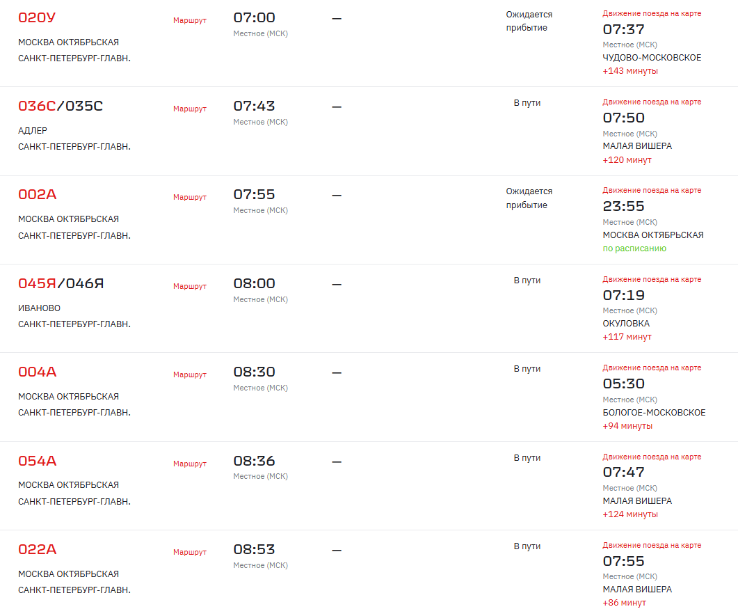 По данным онлайн-табло Московского вокзала, в диапазоне от 18 до 143 минут задерживаются в пути до Петербурга 11 поездов дальнего следования. Самая большая задержка в 2,5 часа — у поезда 020У, следующего с Ленинградского вокзала в Москве. Состав должен был приехать ещё в 7 утра, но он по-прежнему в пути.
