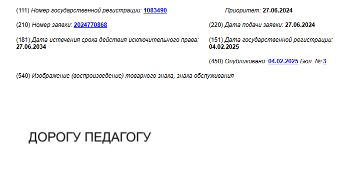 Петербурженка, ставшая автором популярного в Сети мема, зарегистрировала товарный знак "Дорогу педагогу", указано в документах Федерального института промышленной собственности (ФИПС).