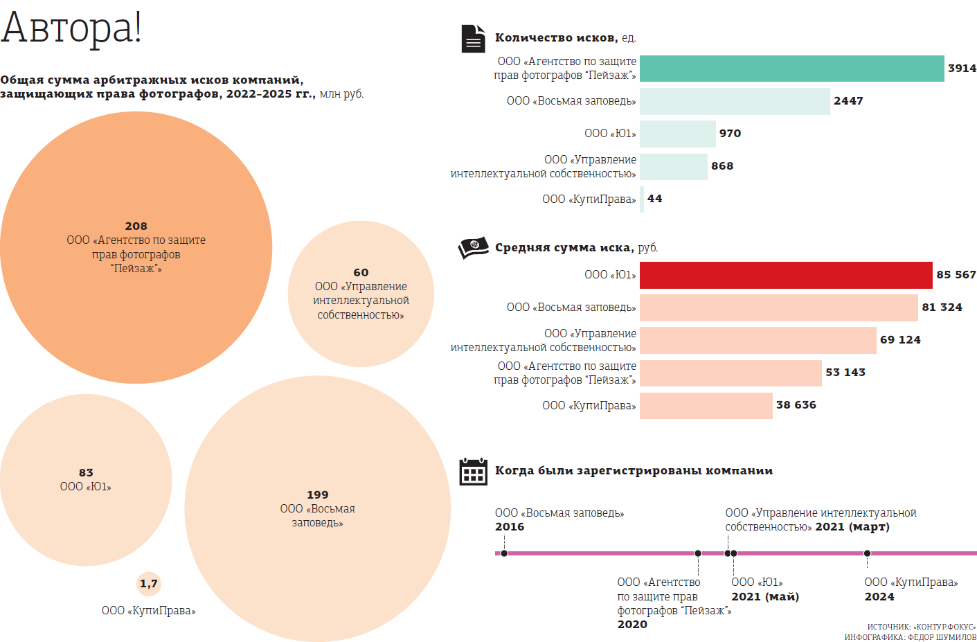 "Компании или юристы действуют по отточенной схеме. Сначала заключают с фотографами договоры о полной передаче (отчуждении) исключительных прав на фотографии или договоры доверительного управления правами. Потом с помощью автоматизированных сервисов осуществляют массовый поиск и фиксацию использования этих изображений в интернете. И далее уже направляют досудебные претензии и подают иски о взыскании компенсации, часто многократно завышая суммы требований", — объясняет представитель СПФСПб, юрист–партнёр юридической фирмы "Солнцев и партнёры" Вадим Сторчак.