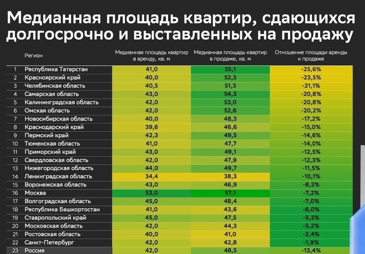 При этом самая большая разница в площади недвижимости, предлагаемой в аренду и на продажу, зафиксирована в Татарстане — на 25,6%, Красноярском крае — на 23,5% и Челябинской области — на 21,1%.