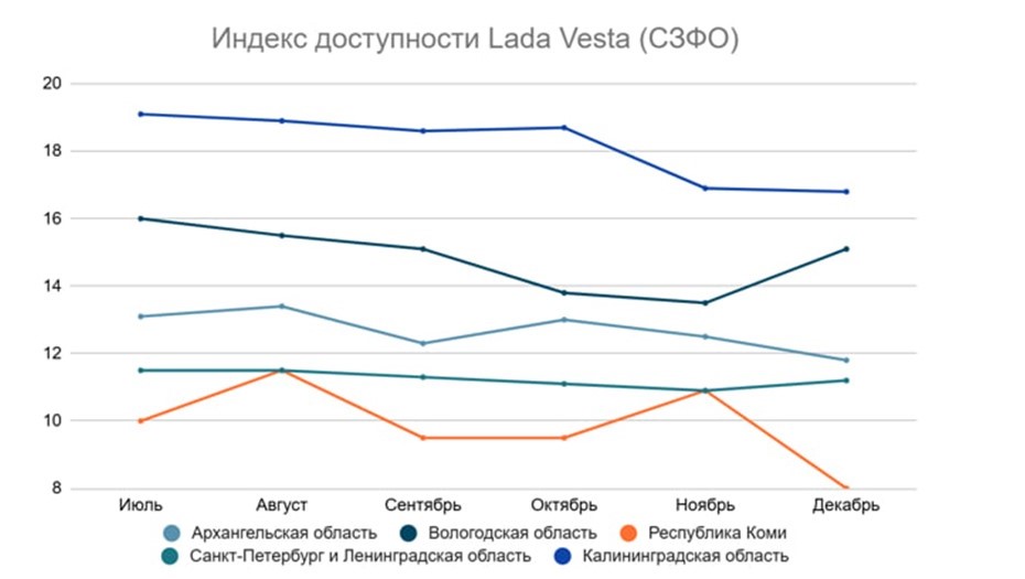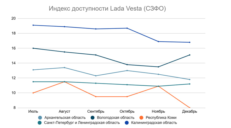 "По итогам полугодия в СЗФО Lada Vesta была доступнее всего для жителей Республики Коми (8 медианных зарплат), Ленинградской области и Санкт-Петербурга (11,2), также Архангельской области (11,8)", — отметили аналитики.