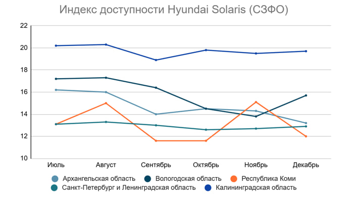 Похожая картина и с Hyundai Solaris: быстрее всего на него накопят жители Республики Коми (12 медианных зарплат), Ленинградской области и Петербурга (12,9), а также Архангельской области (13,2). Жители Вологодской и Калининградской областей будут копить на такую машину 15,7 и 19,7 зарплат.