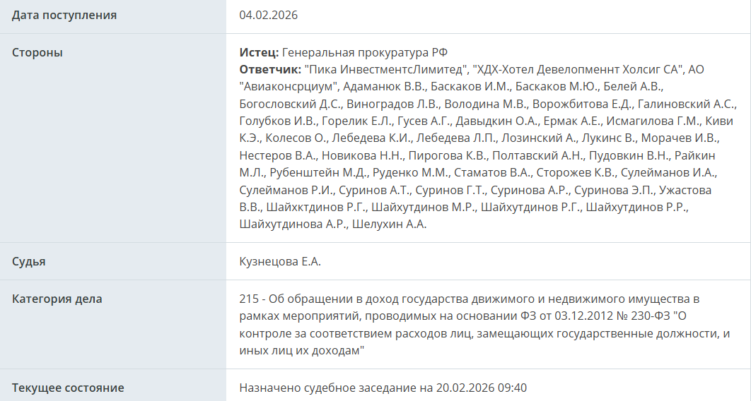 Ранее суд выполнил требование Генпрокуратуры 11 февраля: активы владельцев ГК "Сирена-трэвел" были арестованы, депутату Шайхутдинову запретили выезд из России. Также суд также наложил обеспечительные меры на активы ответчиков: доли и акции компаний, входящих в ГК "Сирена-трэвел", оператора системы бронирования авиабилетов "Леонардо".