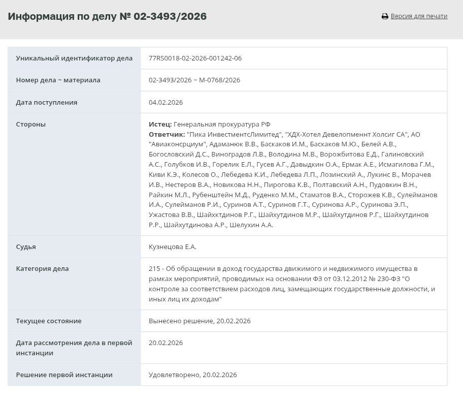 Прокуратура требует передать в собственность государства все четыре общества, а также нераспроданную недвижимость в составе комплекса (помещения конференц–зала, ресторана, спа и незначительная часть апартаментов).