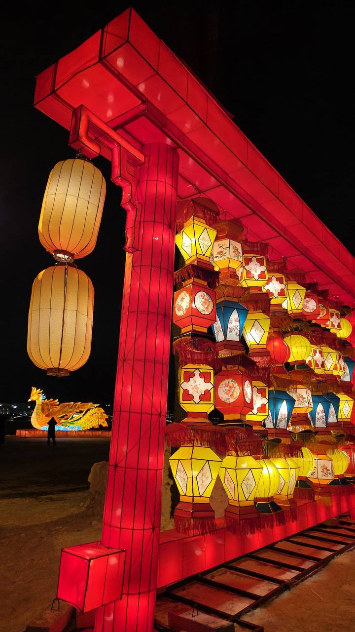 Под открытым небом в рамках фестиваля установлены десять светящихся композиций, их изготовили мастера провинции Сычуань. Среди фигур есть символ 2026 года в виде огненной лошади.