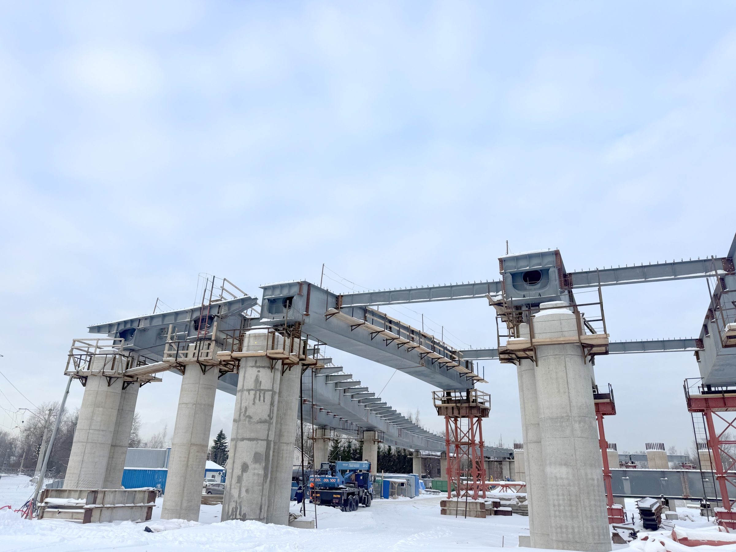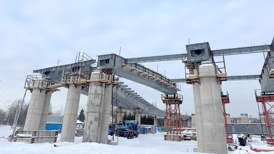 "Сейчас специалисты завершают монтаж металлических конструкций пролётных строений на первом из съездов. Балки уже установлены на всех доступных опорах, благодаря чему сформирован профиль будущего сооружения", — пояснили в Смольном.