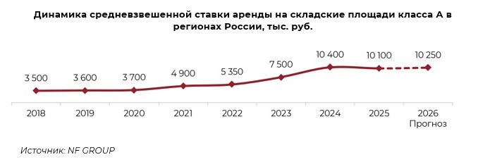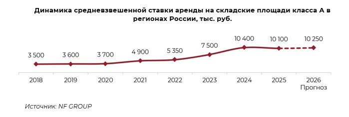 В 2026 году средневзвешенная ставка аренды на склады класса А прогнозируется на уровне около 10,2 тыс. рублей за м2 в год.