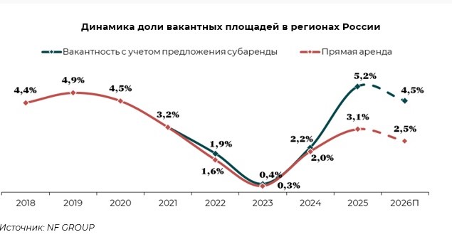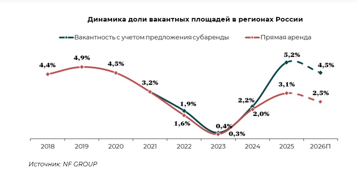 "На этом фоне доля вакантных площадей, включая субаренду, по итогам 2025 года выросла до 5,2% (+3 п. п. за год), однако к концу 2026 году может снизиться до 4,5% за счёт увеличения объёма сделок до 1,6–1,8 млн м2", — указано в сообщении.