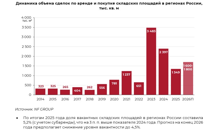 Вакантность на рынке складской недвижимости в регионах России снизится с 5,2% до 4,5% до конца 2026 года, прогнозируют в NF GROUP.