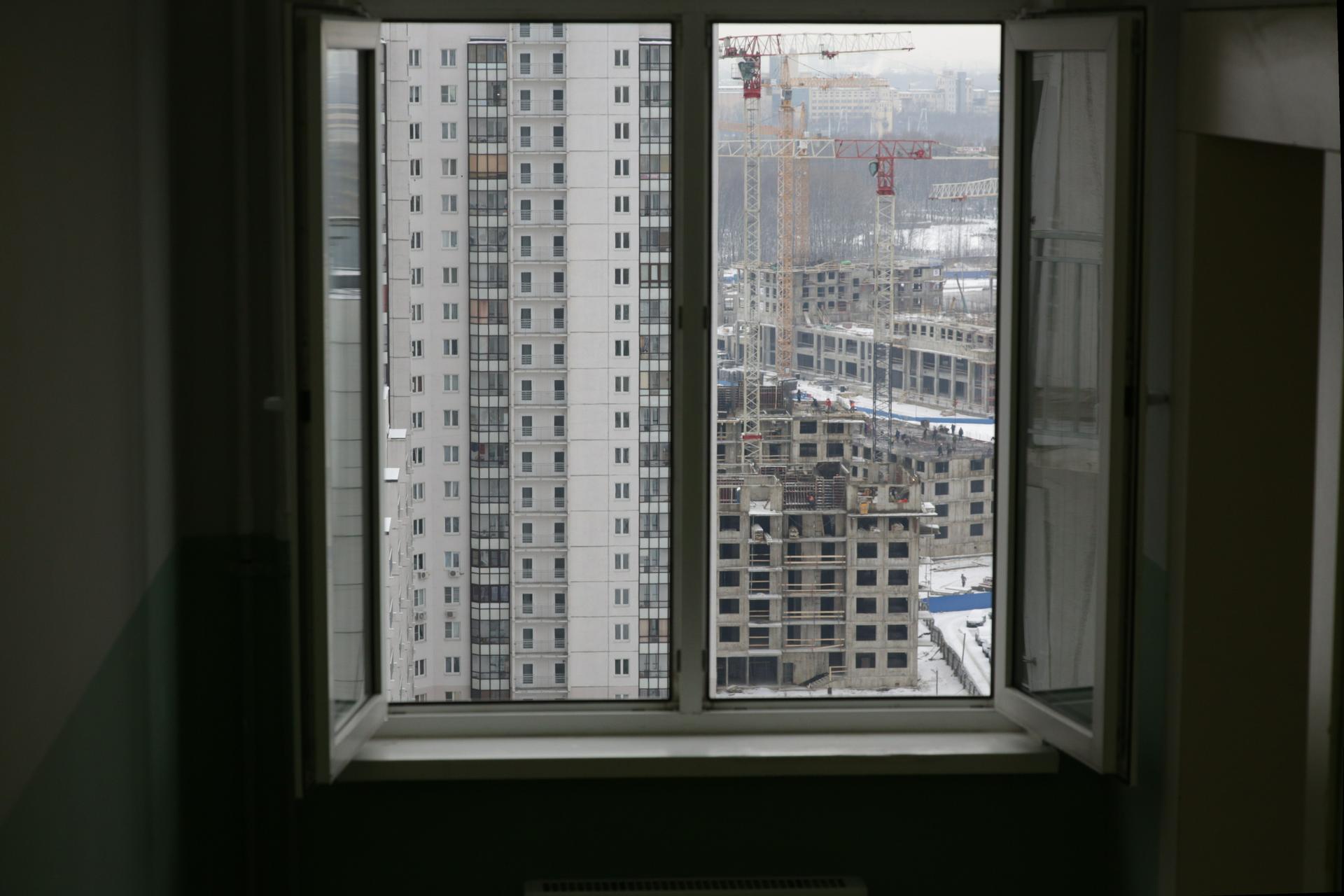 Россия. Санкт-Петербург. Невский район, Веселый поселок. Вид на строительство ЖК "Коллонтай, 2" из окна жилого дома.